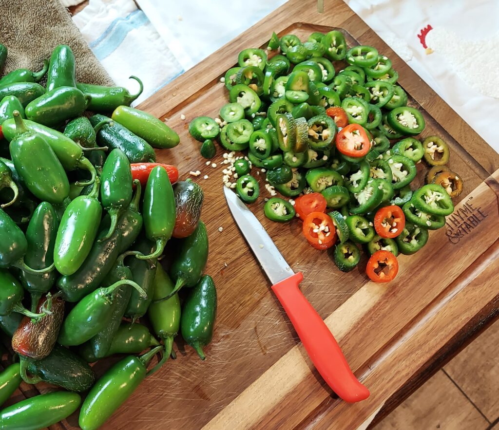 Slice your peppers. Thickness doesn’t matter. Just a personal preference. You can remove the seeds for a milder heat.