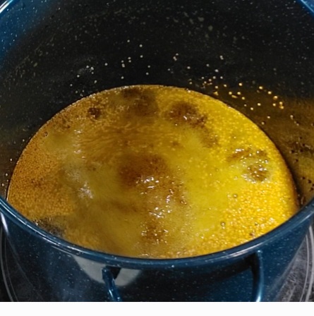 In a large pot bring the apple cider vinegar, sugar, mustard seed, and tumeric to a boil. Don’t freak out on how much sugar goes into this. It’s for the whole batch and this is a relish/topping so you’re not eating a whole jar in one sitting. Let’s continue. Reduce heat and simmer for 8 minutes.
